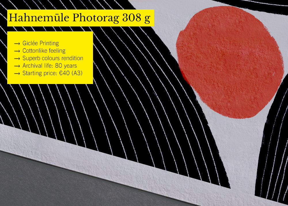 This is the paper I use for art prints. It has a surface with a minimal cottonlike texture. Nonetheless colours and details rendition are gorgeous. I love it because it's off white and perfect for the Giclée printing, and it's able to deliver a sort of natural and handmade feeling to the print. Prices start at around €40 for small A3 alike formats and up to €185 for larger formats. Each print comes with its own Certificate of Authenticity.